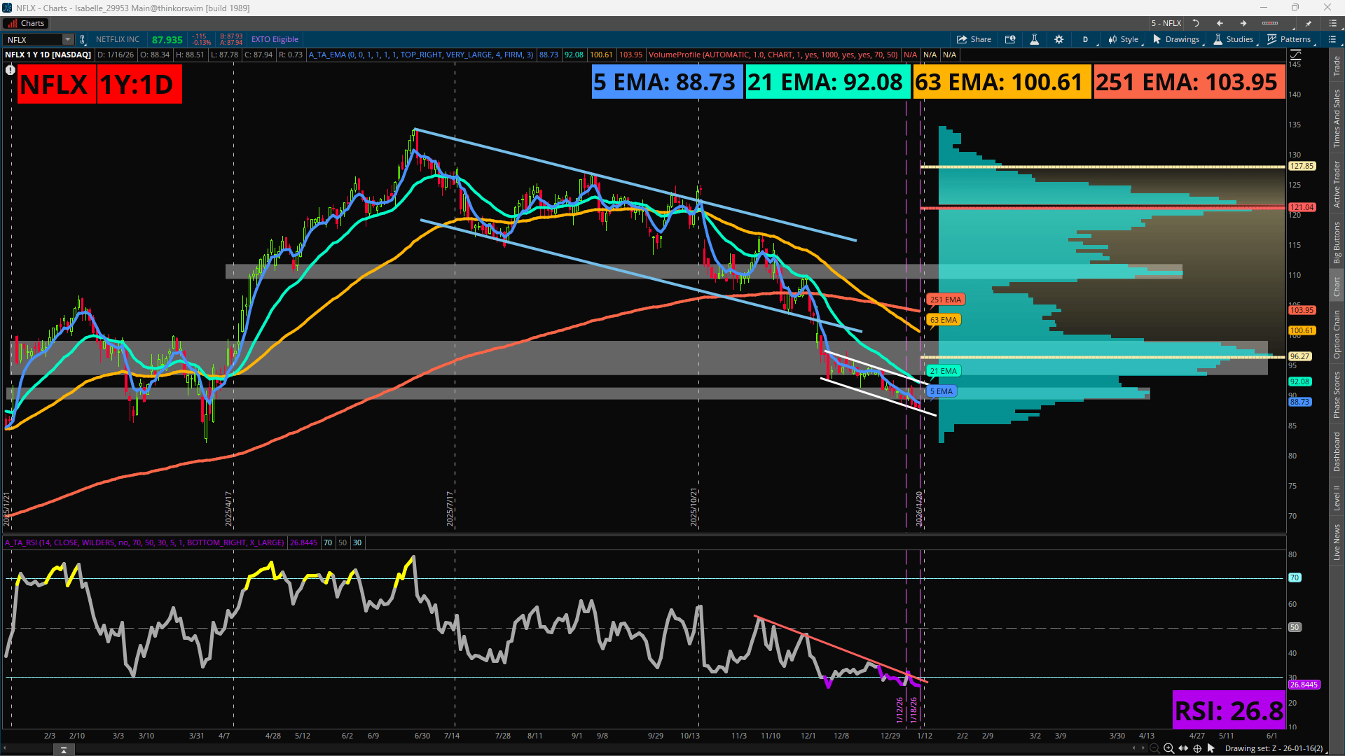 Downside momentum has slowed somewhat after repeated entries into the oversold area into what may be viewed as mild bullish divergence from price, but waning momentum heading into earnings is common so this information should be viewed with a grain of salt. Price also remains below a small node according to the yearly Volume Profile study centered roughly around the 90 area, with the next notable heavy trading activity price level coming in near 96. To the downside, the 83 to 85 area presents a critical support zone for the bulls to hold.