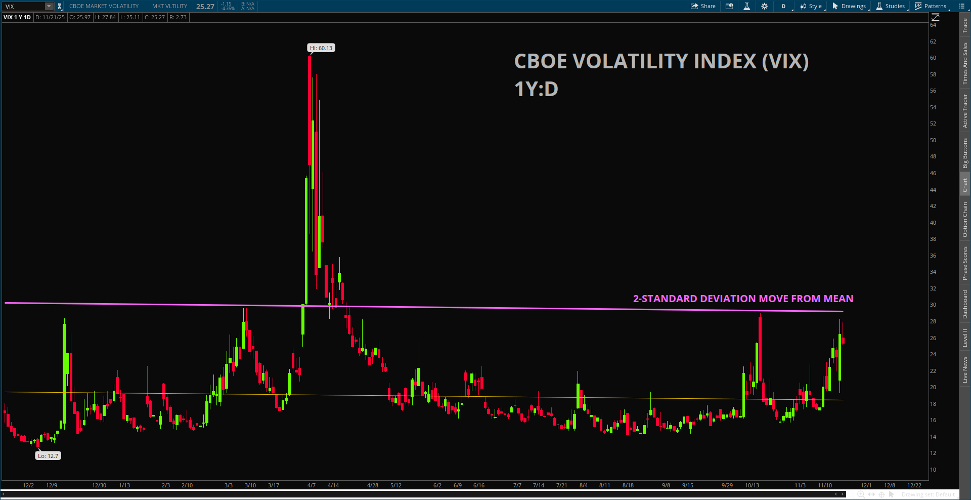 Importantly, the VIX has not breached a 2-standard-deviation move from its 1-year mean. That suggests we may face additional turbulence in the next couple of days, but the setup is more mechanical than structural, especially with November monthly options expiration today. Roughly $3.1 trillion in notional value will expire, which should relieve some pressure on the volatility complex as institutions roll and reset positions heading into the December quarterly expiration.