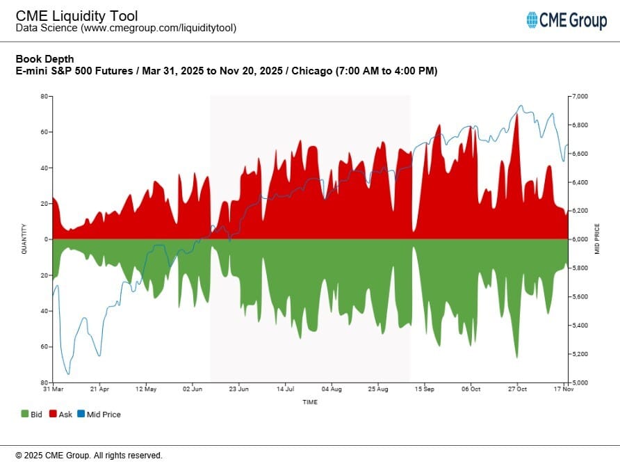 Lastly, liquidity is critical for volatility to compress. At the moment, liquidity remains exceptionally thin when measured by E-Mini S&P 500 book depth. When depth begins to expand — meaning larger sizes reappear on both the bid and the ask — it typically signals improving liquidity conditions, which in turn helps push volatility lower.