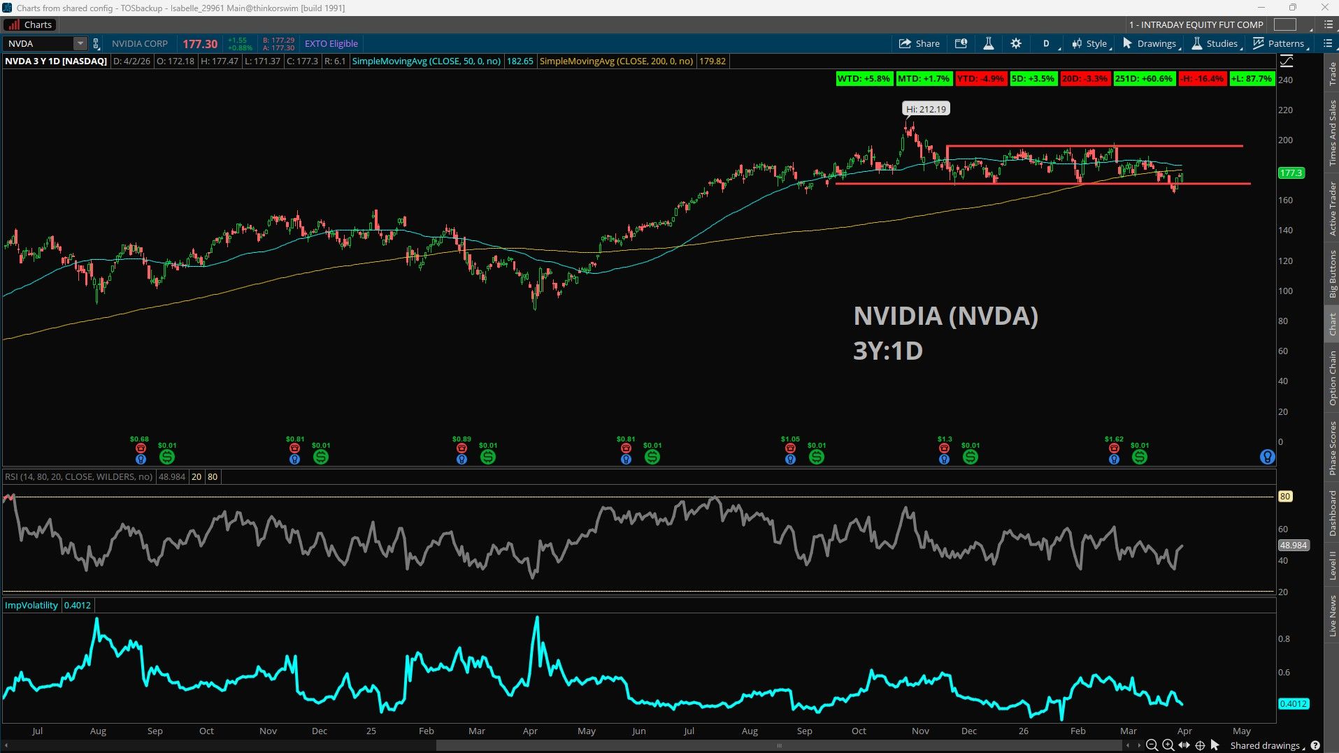 For long term investors, NVDA may be a quality way to express conviction in the AI trade. Although the stock is down 5% this year and off 16% from its all-time high, you have to look at a longer term view of the stock as to why we have seen consolidation over the last several months. Nvidia shares are up over 570% over the last three years, so it has had a spectacular run. The question for investors is: have the shares hit a near-term bottom and can the stock get back to its recent resistance level around $195?