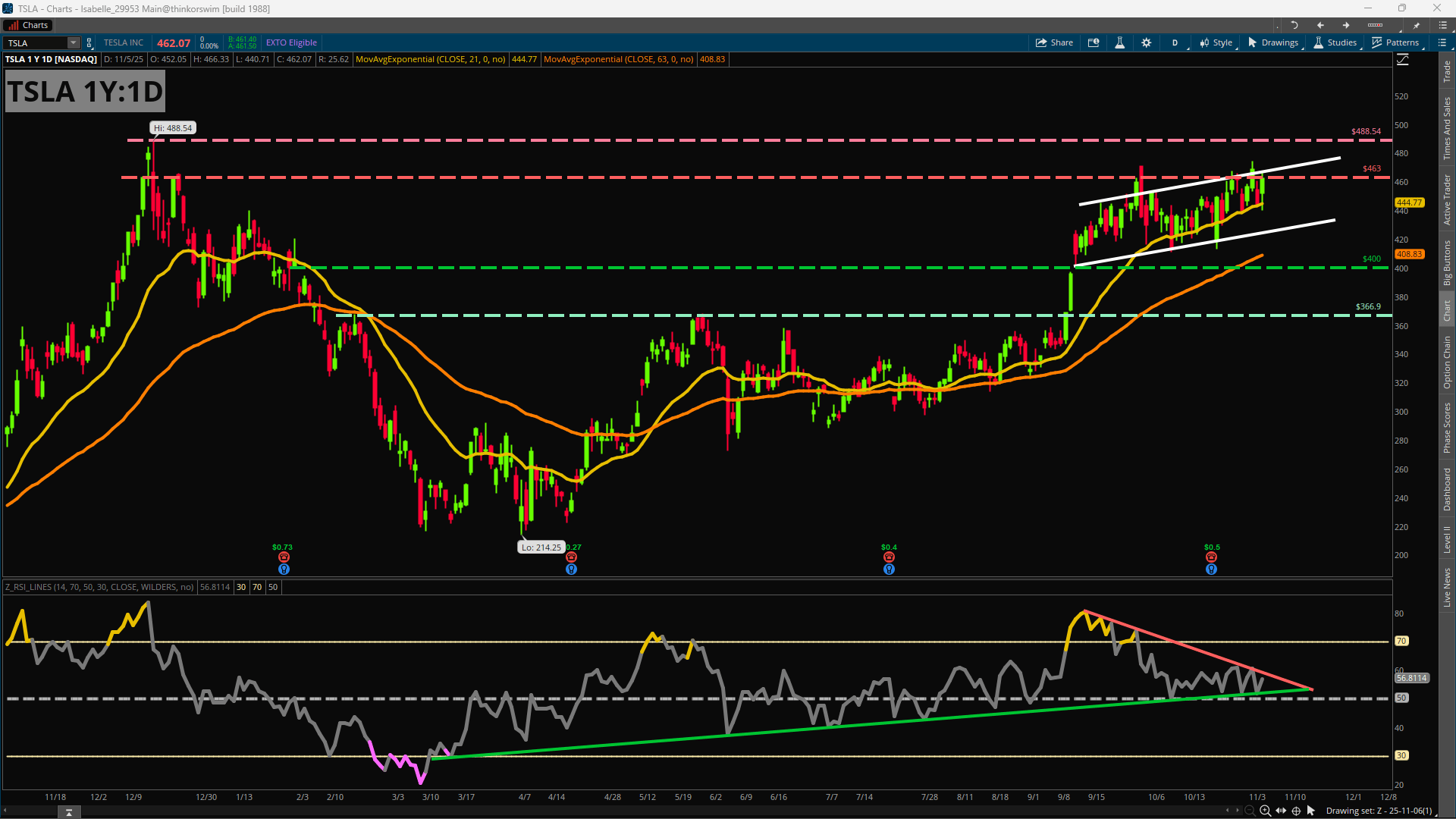 Tesla’s recent price activity has shown a modest upward sloping channel but has recently stalled out around some old highs near $463. This area represents some notable high closing prices from December as well as a recent test from early October. Earnings late last month did not translate into any significant breakouts, while the RSI paints a picture of slowing momentum. The indicator shows lower highs as price makes higher highs, which is a mismatch called bearish divergence and is typically regarded as a potential warning sign. However, at the same time, it also has been grinding higher for most of the year and remains above the 50 midline even as the reading compresses in an increasingly narrowing range.